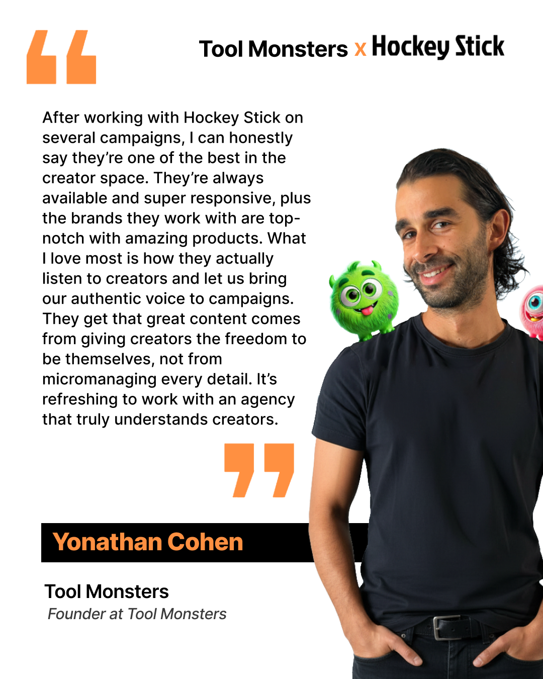 Working with Hockey Stick — Pure collaboration magic. • Easy partnership from the start • Incredible energy + deep creative respect • Always full of brilliant ideas.