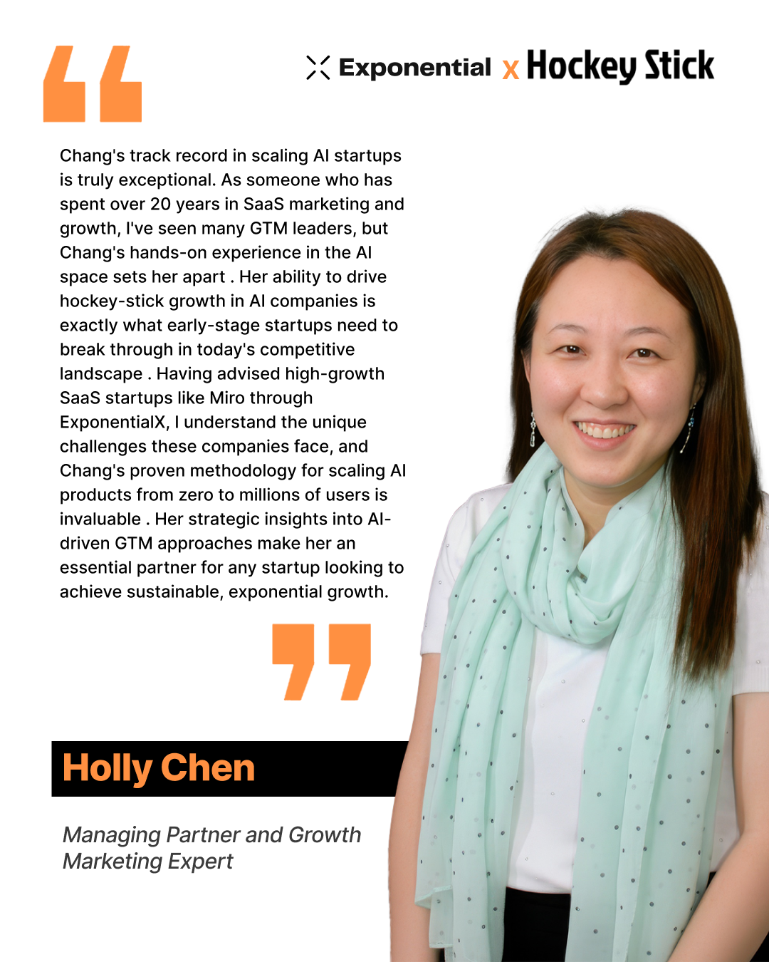 "Chang's track record in scaling AI startups is truly exceptional. As someone who has spent over 20 years in SaaS marketing and growth, I've seen many GTM leaders, but Chang's hands-on experience in the AI space sets her apart . Her ability to drive hockey-stick growth in AI companies is exactly what early-stage startups need to break through in today's competitive landscape . Having advised high-growth SaaS startups like Miro through ExponentialX, I understand the unique challenges these companies face, and Chang's proven methodology for scaling AI products from zero to millions of users is invaluable . Her strategic insights into AI-driven GTM approaches make her an essential partner for any startup looking to achieve sustainable, exponential growth."