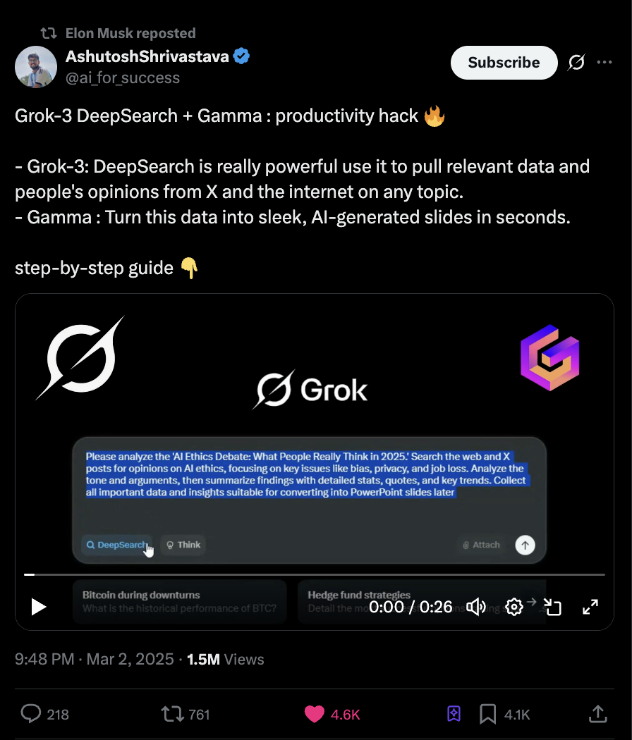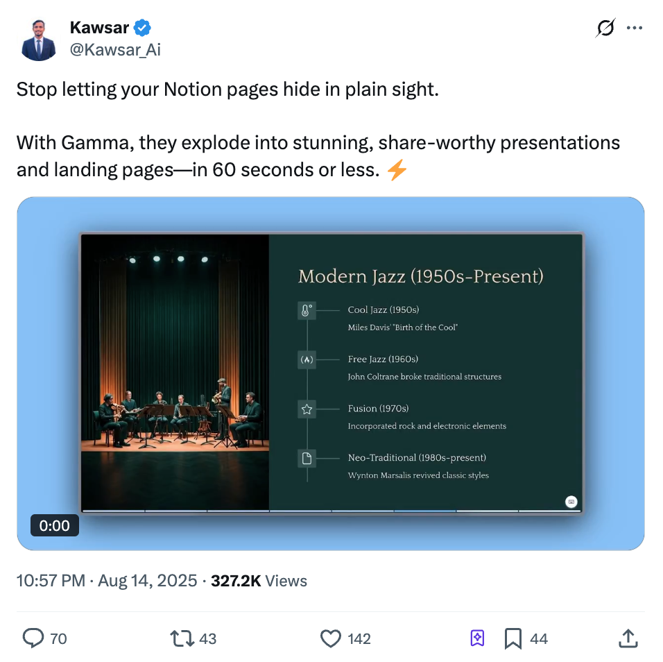 Gamma tested everything. New platforms, content directions, viral hooks, platform-specific formats—1,500+ creators, 1B+ views across X, LinkedIn, and Instagram. Some even caught Elon Musk’s eye (more than once). Every trend became an experiment; every creator, a lab.Creators: Go wide, test relentlessly, reward virality, and scale winning formats.